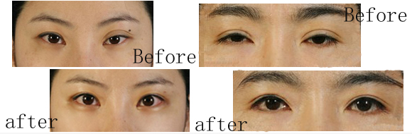 過(guò)窄:沿原切口切開,充分剝離重瞼線以下皮膚,去除瞼板前的眼輪匝肌及瞼板前組織,利用上瞼皮膚的伸展性,將切口上提縫合以 達(dá)到增加重瞼的寬度(可增加寬度1-3毫米)。此種方法還可使年輕患求美者的睫毛上翹,增加美感。另外,由于重瞼線下皮下組織被去薄,手術(shù)后雙眼皮還會(huì)更 加逼真自然。